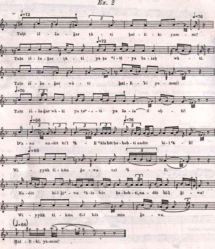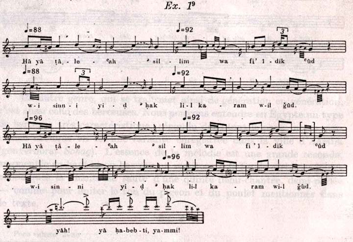 Un autre genre, qui se transmet ainsi de génération en génération, c'est aussi celui des berceuses. Nous pouvons entendre en Égypte un type de berceuse très caractéristique, répandu dans tout le pays; notre quatrième exemple en est une variante enregistrée dans la ville d'Ahmim (gouvernorat Sohag). L'essence de la mélodie est une grande seconde, augmentée en haut et en bas par un semiton. A la fin de certaines lignes mélodiques la chanteuse saute d'une quinte demi-chantée, demi-parlée - comme pour imiter le ton du pigeon et du poulet mentionnés dans le texte.