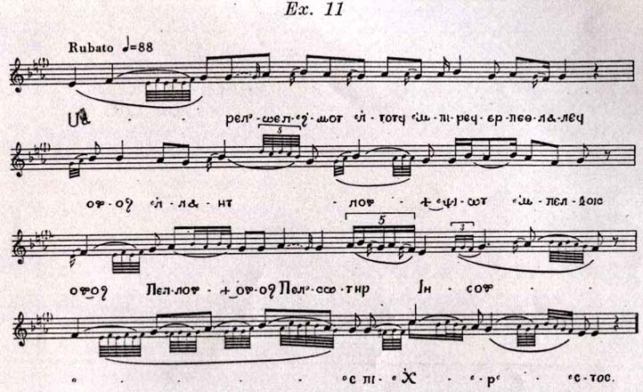 Malgré tout cela nous ne pouvons évoquer aucun fragment mélodique de cette musique qui - d'après le témoignage des Grecs qui l'ont encore entendue - était tellement grandiose. Mais à défaut de notations musicales les méthodes exclusivement historiques ne peuvent nous éclaircir sur ce point.