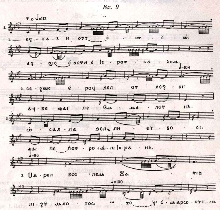 des semitons (au lieu desquels on chante quelquefois des 3/4 tons) avec des tons, dans l'ordre suivant: 1/2, 1, 1/2, 1, - et, parfois, encore: 1/2, 1. Pour les mélodies populaires - en dehors du témoignage de notre propre collection (encore inédite) - nous pouvons citer quelques exemples d'une publication assez récente: Baheega Sidky Rasheed: Egyptian folk Songs New York, 1964, numéros 8, 42, 54, 58, 94, 95. (Dommage, que les notations sont faites après des variantes «arabisées», utilisant des secondes augmentées, qui d'ailleurs dans l'exécution par des fellahs apparaissent très rarement.)Quant à la liturgie copte, une grande partie de la messe et plusieurs hymnes sont chantés dans ce ton.30 Pour en donner un petit exemple, nous publions le commencement de l'Anaphora, de la Messe de St. Basile: