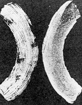 Dent non travaillee d'hippopotame. La surface exterieure montre les rainures de croissance. A l'interieur, la matiere au bord se distingue de celle du milieu, plus tendre. La pointe a ete coupee.