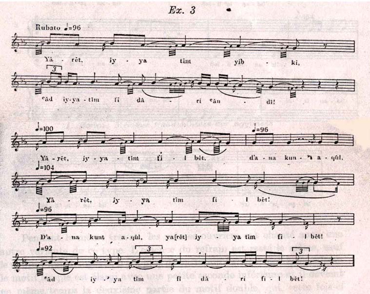 Une chose est certaine; la tonalité de ces deux mélodies est très fréquente parmi les chansons populaires égyptiennes, comme parmi les mélodies de la liturgie copte aussi. Cette tonalité - semblable aux <échelles de distance> de la musique moderne - consiste dans l'alternance