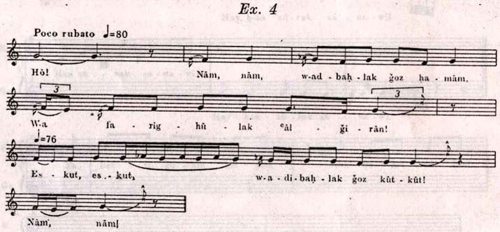 Un autre genre, qui se transmet ainsi de génération en génération, c'est aussi celui des berceuses. Nous pouvons entendre en Égypte un type de berceuse très caractéristique, répandu dans tout le pays; notre quatrième exemple en est une variante enregistrée dans la ville d'Ahmim (gouvernorat Sohag). L'essence de la mélodie est une grande seconde, augmentée en haut et en bas par un semiton. A la fin de certaines lignes mélodiques la chanteuse saute d'une quinte demi-chantée, demi-parlée - comme pour imiter le ton du pigeon et du poulet mentionnés dans le texte.