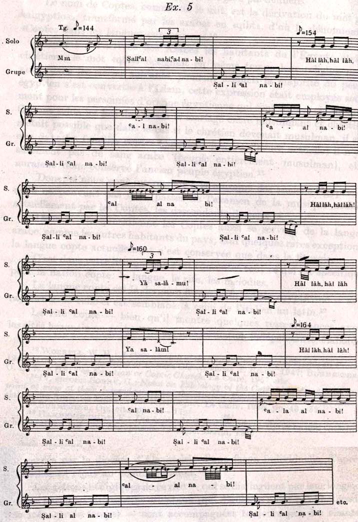des semitons (au lieu desquels on chante quelquefois des 3/4 tons) avec des tons, dans l'ordre suivant: 1/2, 1, 1/2, 1, - et, parfois, encore: 1/2, 1. Pour les mélodies populaires - en dehors du témoignage de notre propre collection (encore inédite) - nous pouvons citer quelques exemples d'une publication assez récente: Baheega Sidky Rasheed: Egyptian folk Songs New York, 1964, numéros 8, 42, 54, 58, 94, 95. (Dommage, que les notations sont faites après des variantes «arabisées», utilisant des secondes augmentées, qui d'ailleurs dans l'exécution par des fellahs apparaissent très rarement.)Quant à la liturgie copte, une grande partie de la messe et plusieurs hymnes sont chantés dans ce ton.30 Pour en donner un petit exemple, nous publions le commencement de l'Anaphora, de la Messe de St. Basile: