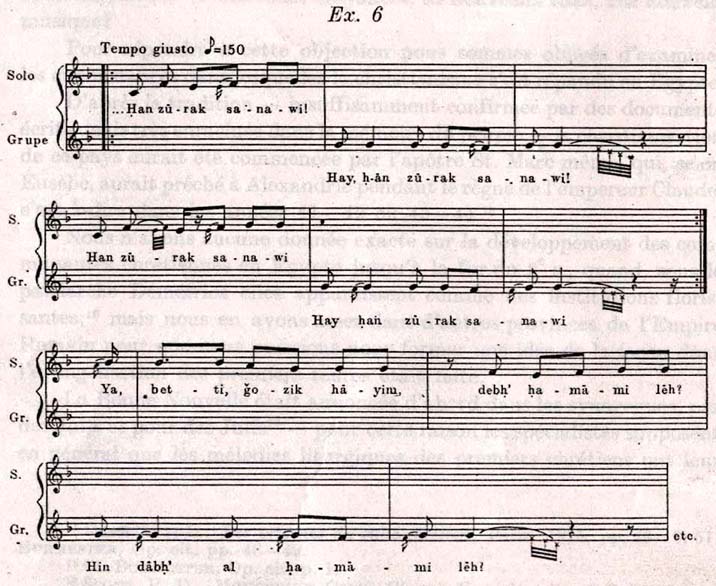 Pour illustrer ce phénomène, nous publions une partie du troisième <hos> de l'office «Psalmodeya» de nuit, dont le texte est le cantique des trois jeunes gens dans la fournaise. La transcription est faite d'après le chant de Tewfik Youssef, chantre aveugle du monastère copte orthodoxe Deir El Moharraq (Haute Egypte).23