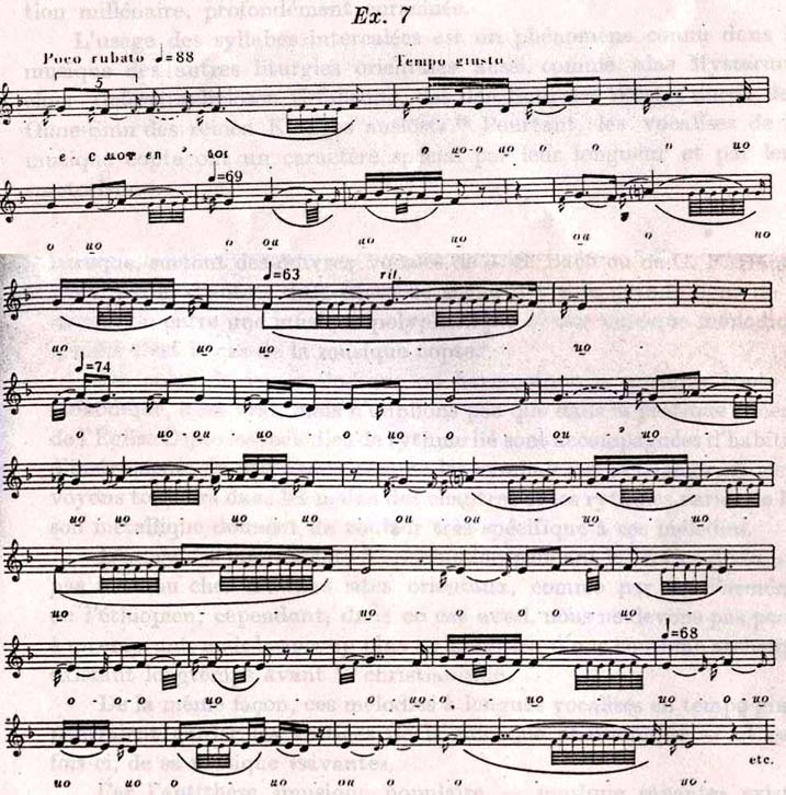 L'usage des syllabes intercalées est un phénomène connu dans la musique des autres liturgies orientales aussi, comme «das Mysterium einer tieferen religiösen Erfahrung, das den Sinn des Wortes durch den Ohne-Sinn des reinen Klanges auslöst».28 Pourtant, les vocalises de la musique copte ont un caractère spécial par leur longueur et par leur «motorisme».