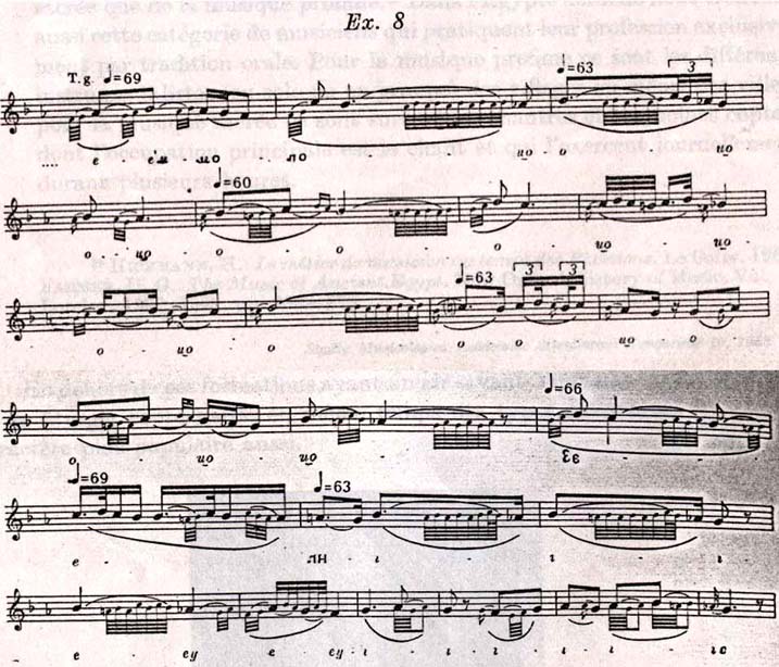 Notre troisième exemple est la dernière partie d'une lamentation du village El Ghanäim (gouvernorat Assiut). Son essence est un tricorde phrygien répété librement.